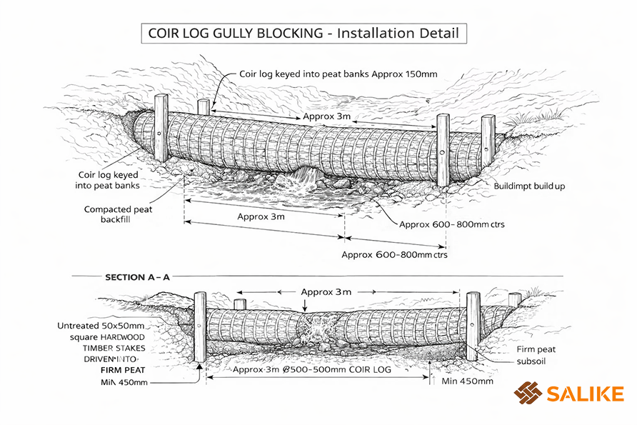 Engineered coir logs offer a measured and effective solution for peatland gully blocking. Installed transversely across erosion channels, they slow water velocity, encourage sediment deposition and assist in re-wetting the peat body upstream of the intervention.